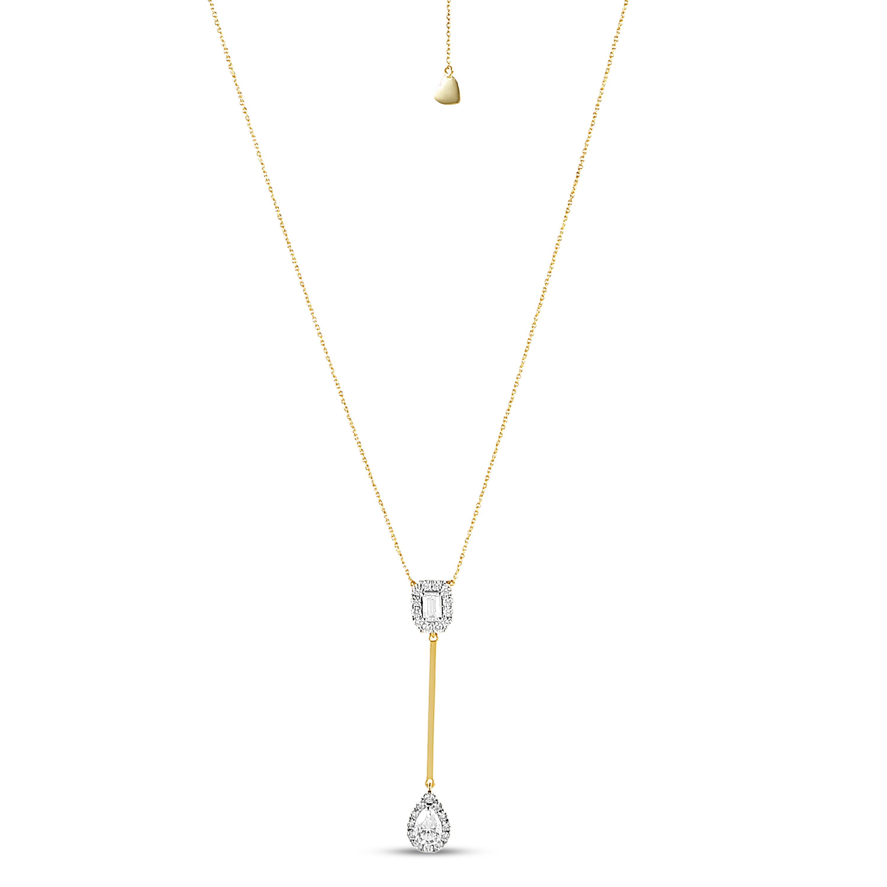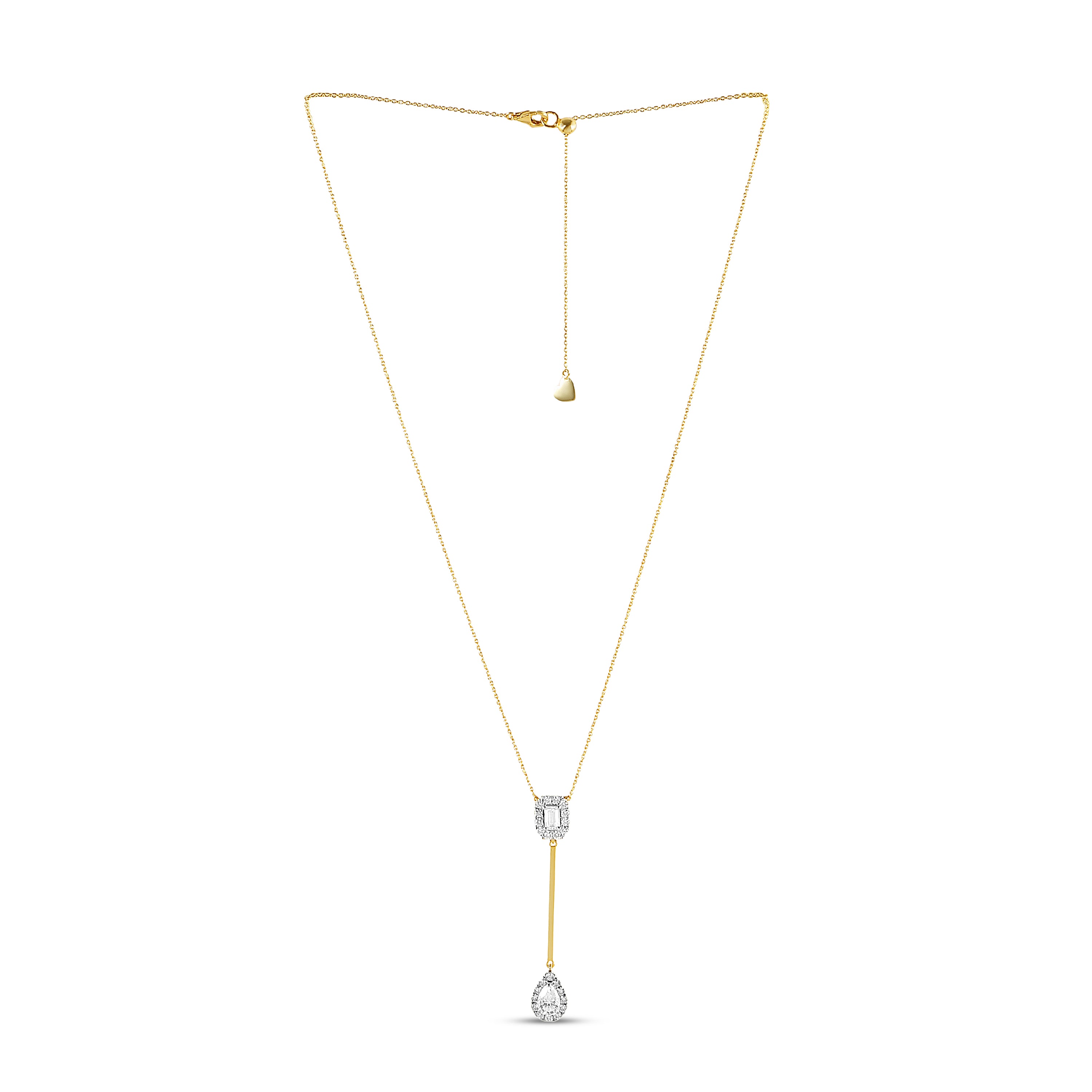 The Aarohi Lariat Necklace features a stunning emerald-cut moissanite paired with a pear-shaped moissanite, both surrounded by halo-set round stones. Crafted in 925 sterling silver, this lariat-style necklace exudes luxury and grace, perfect for special occasions. Adjustable for comfort and style. Available in white and yellow plating.