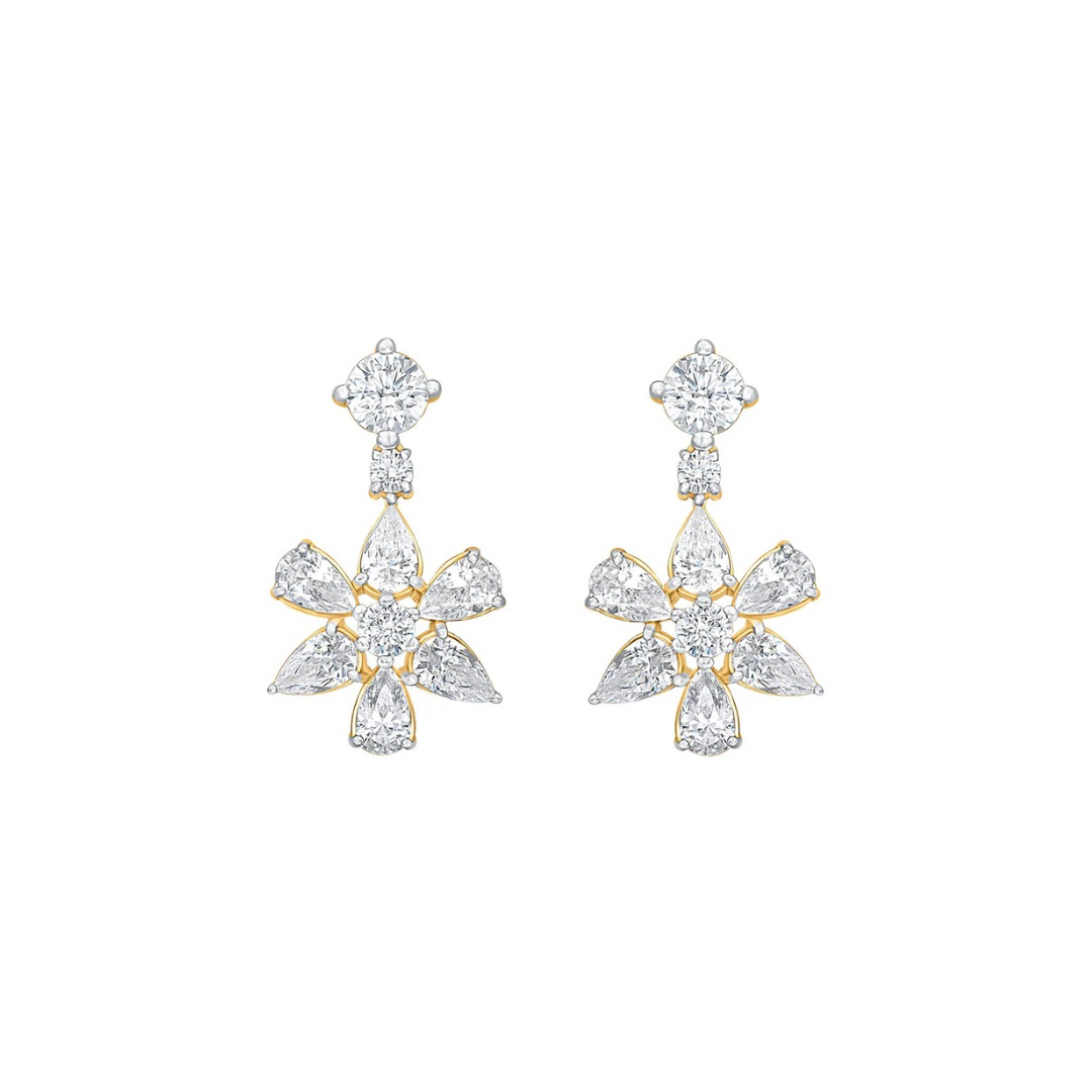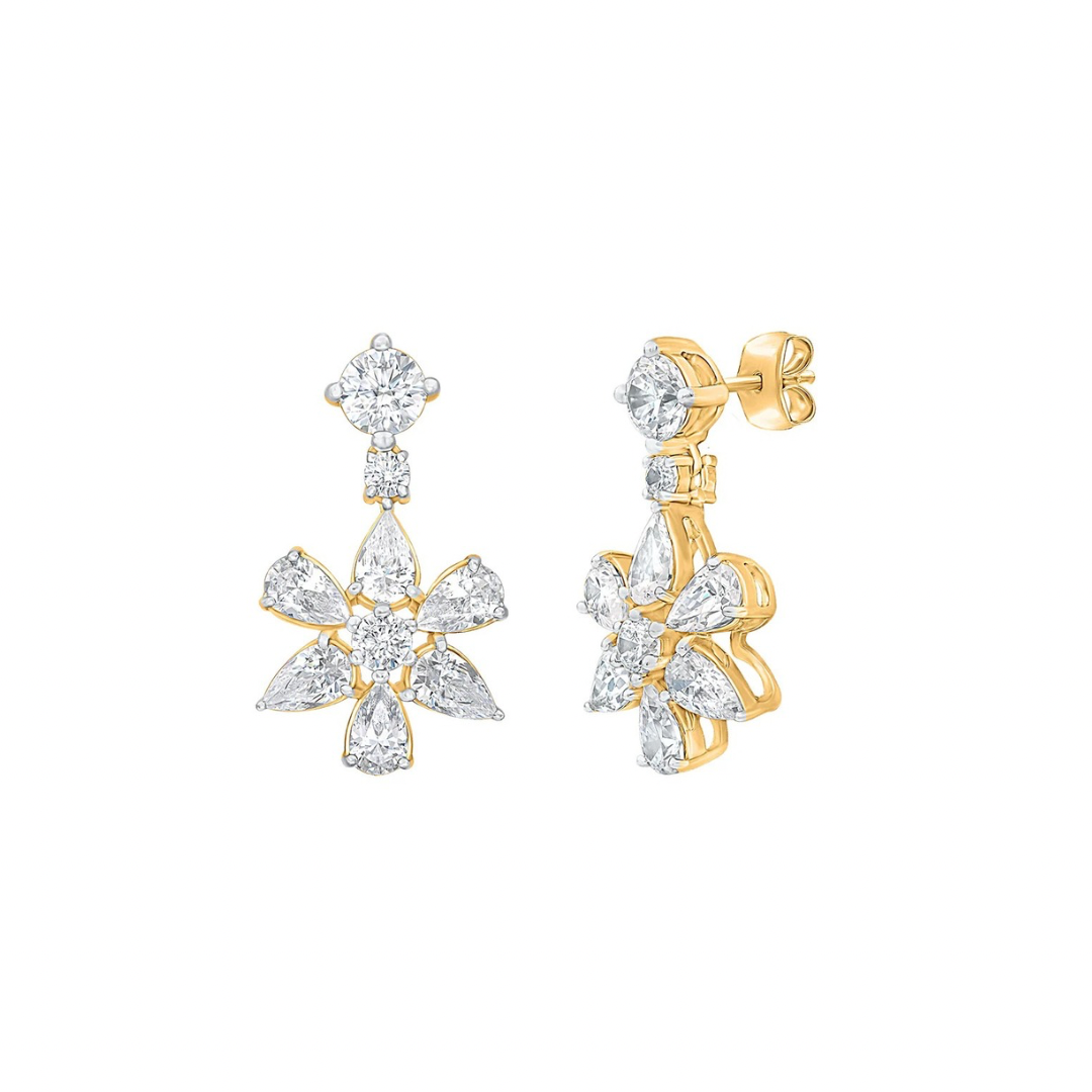 The Nyra Blossom Earrings combine round and pear-shaped moissanite stones in a graceful dangling design that reflects ultimate elegance and sparkle. Handcrafted in 925 sterling silver, these earrings are the perfect balance of femininity and luxury. Ideal for weddings, parties, or statement everyday looks, these moissanite dangle earrings add radiant charm to any outfit. Available in white and yellow plating.