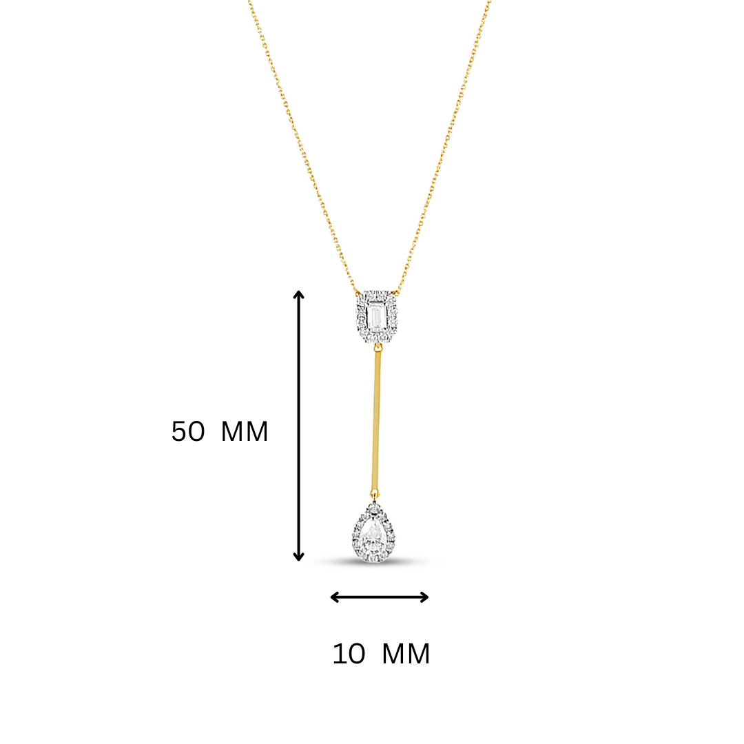 The Aarohi Lariat Necklace features a stunning emerald-cut moissanite paired with a pear-shaped moissanite, both surrounded by halo-set round stones. Crafted in 925 sterling silver, this lariat-style necklace exudes luxury and grace, perfect for special occasions. Adjustable for comfort and style. Available in white and yellow plating.
