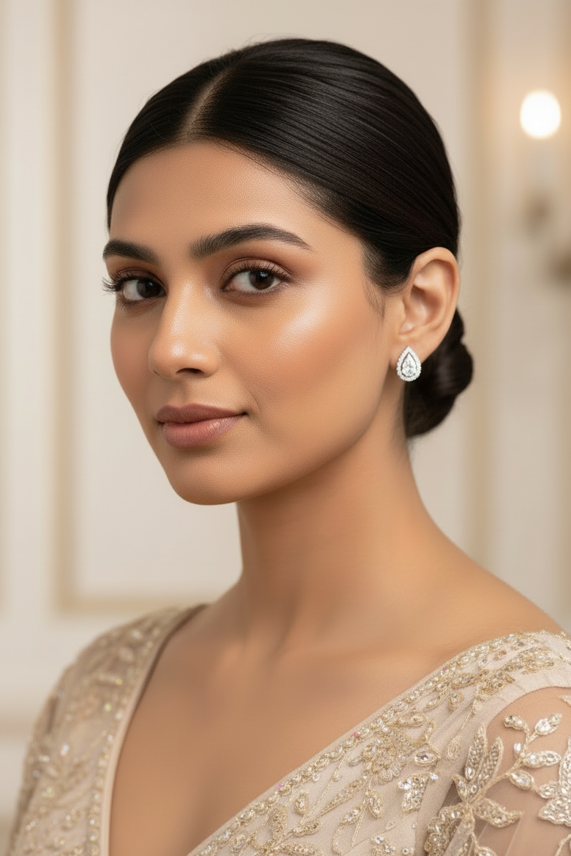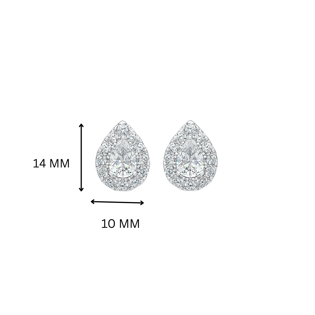 The Eira Pear Halo Studs feature a pear-shaped moissanite stone encircled by a halo of brilliant round stones. Crafted in 925 sterling silver, these earrings radiate timeless beauty and sparkle. Perfect for bridal looks, festive wear, or refined everyday elegance. Available in white and yellow plating.
