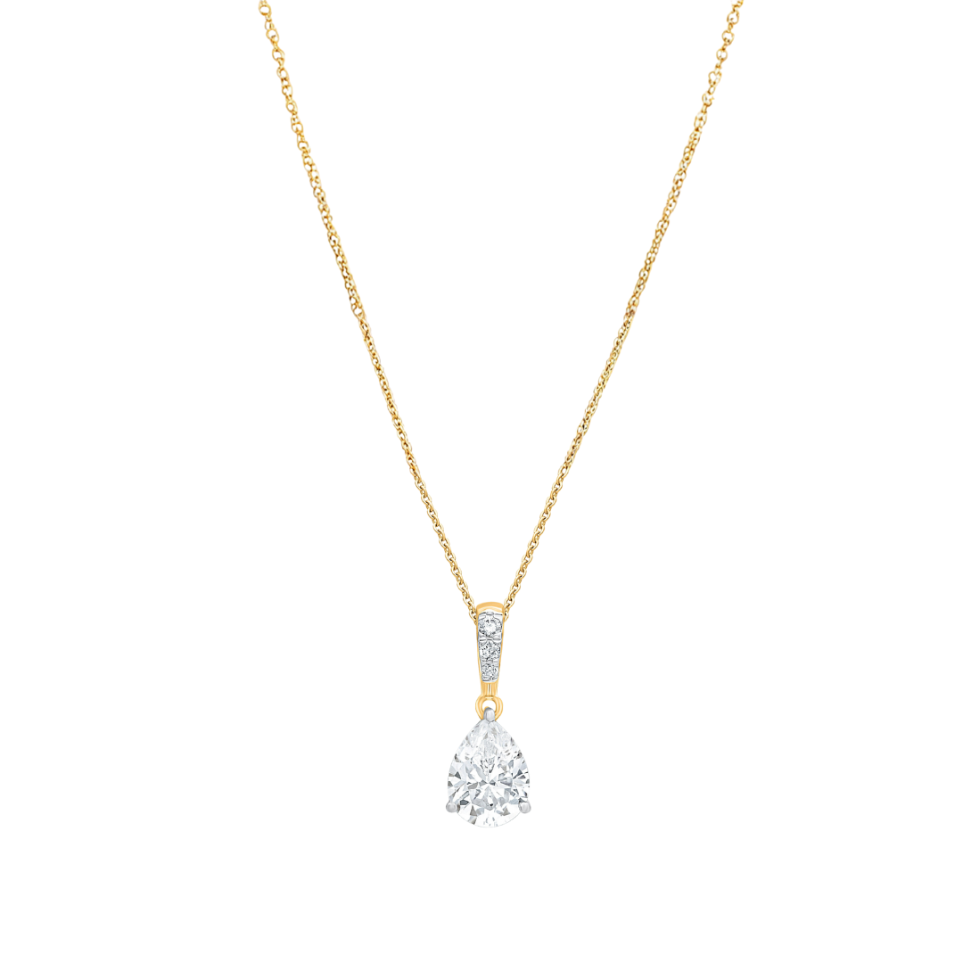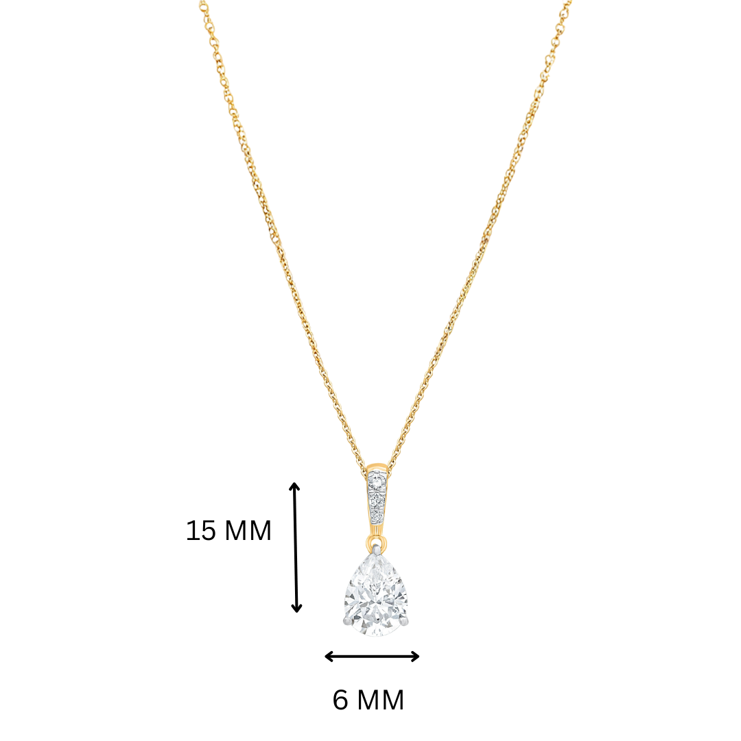 The Meera Pear Drop Pendant embodies elegance with a pear-shaped moissanite gemstone gracefully suspended from a stone-studded bale. Crafted in 925 sterling silver, it combines modern charm with timeless sophistication. The sparkling bale enhances the brilliance of the pear-cut moissanite, making it a perfect accessory for both casual and formal occasions. A must-have pendant for those who adore refined luxury and flawless craftsmanship.